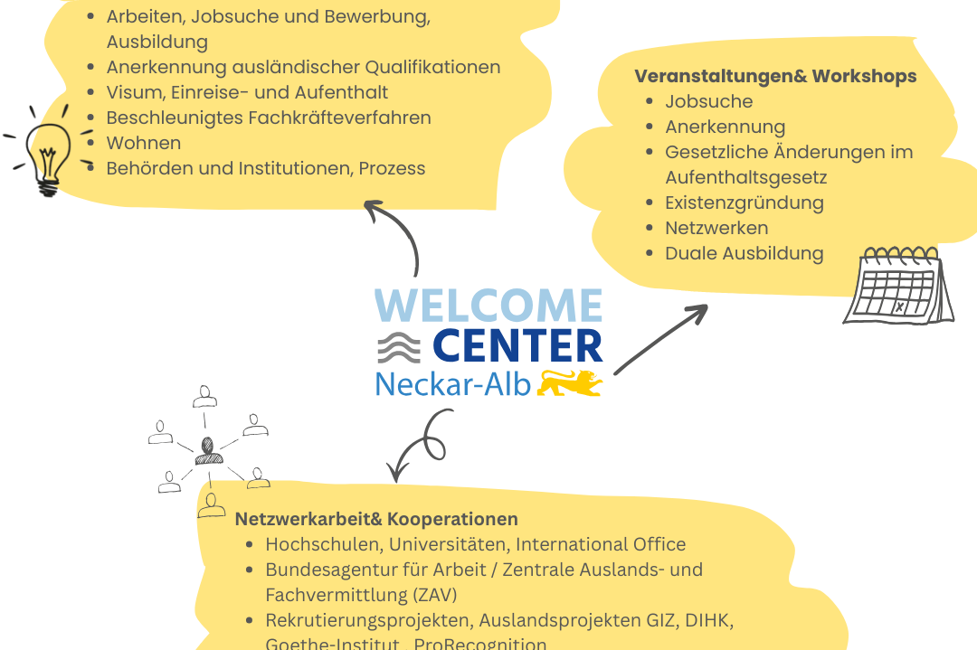 The Neckar-Alb Welcome Center is the central point of contact and offers comprehensive advice and information on various topics that are important for your start in the region. We want you to feel welcome here and get off to a successful start!